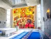 Первое помещение, куда мы зайдём, называется Храм Слова. Слово Божие — как живительный дождь, поэтому светильники здесь выполнены в форме капель. Ярко-синий ковёр на полу напоминает, что рядом Галилейское море, голубой купол и прозрачные стулья придают помещению воздушность.