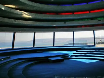 Здание построено из камня цвета Галилейских гор — чёрного и белого, т. е. являет собой как бы часть этих гор. Подъезжая к нему, вы видите чёрную полированную стену с зеркальными окнами, в которых отражается окружающий здание сад.